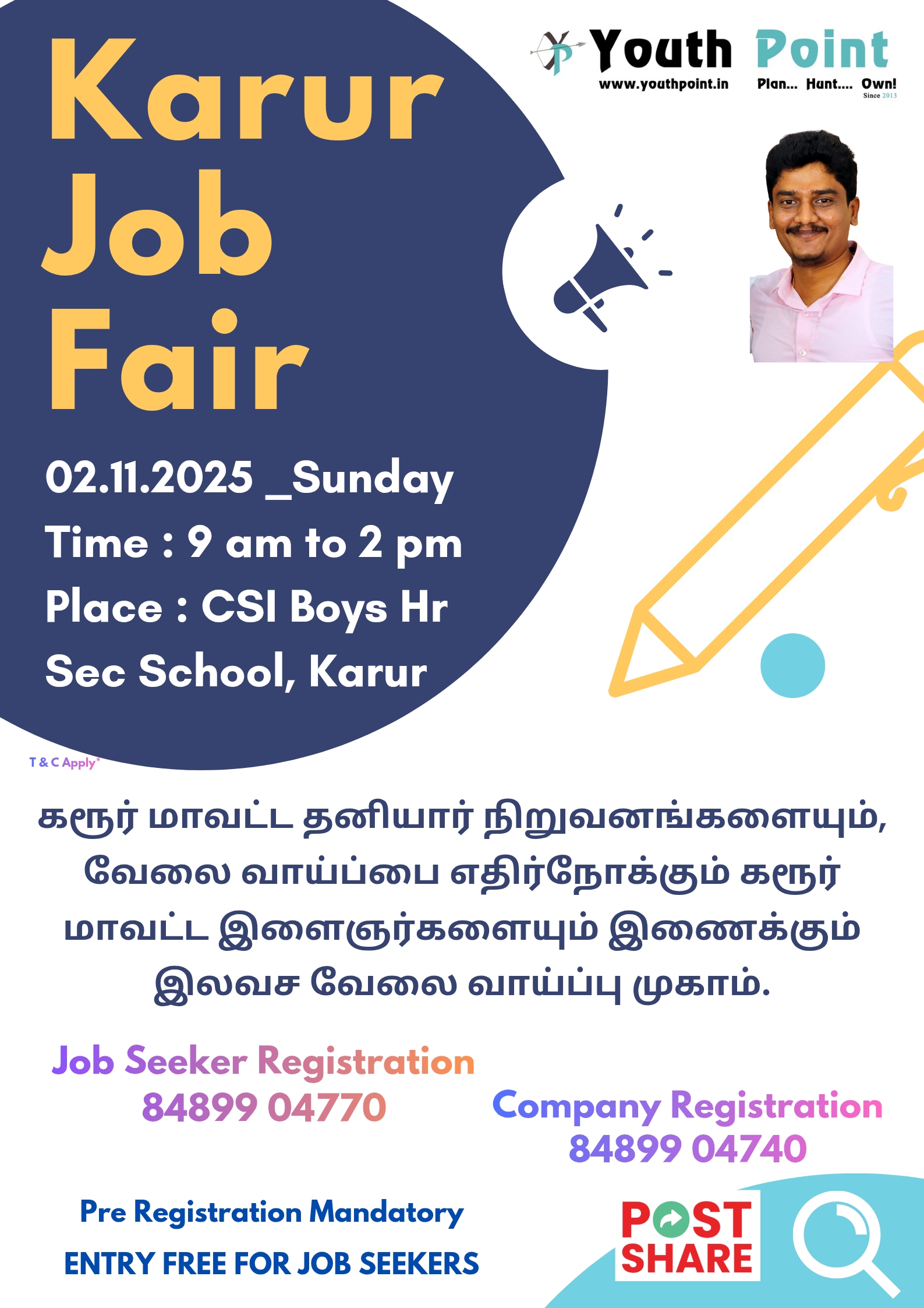 The Youth Point in Karur, Tamil Nadu, is exclusive. Youth Point has never approved a franchise, branch, or personnel agent. We do not assume liability if you fall prey to a fraud on any route. Furthermore, we don't charge job seekers for placement. Kindly be informed.